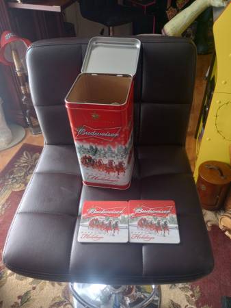 Nice old tin and a few coasters....it came with 4 metal bottles of beer............................Moving and selling off a Huge collection of Halloween and Christmas, building supplies,beer signs, mancave supplies,etc, etc. real nice stuff..........click on the "more ads by this user" link to take a look. email or give us a call six 0 seven 43four two eight eight eight thanks for looking...