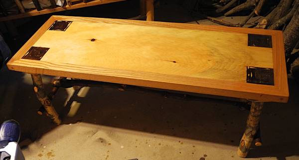 The top is a 1-1/4" pine slab rimmed in oak. Inset into the corners are twigs encased in acrylic. Supporting the top are birch branches mortised into ash half logs. Stabilizing the legs are oak branches between the legs and a longer oak branch tying the leg assemblies together. The table is 48" long by 18" wide by 17" high.